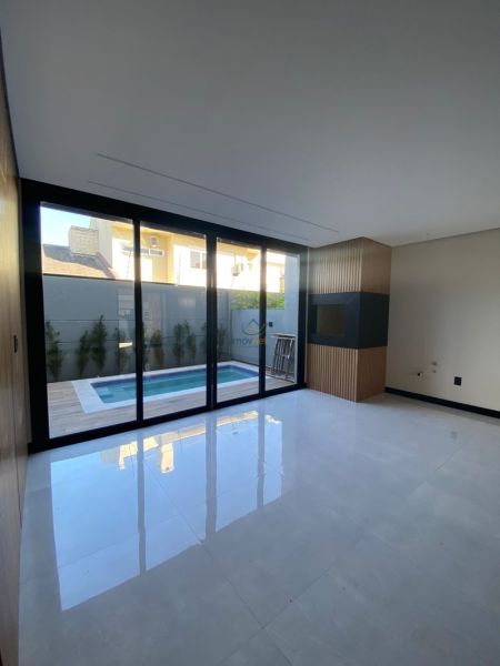 Em condomínio fechado, o sobrado conta com 3 dormitórios sendo, 1 suíte master, banheiro social, lavabo, sala de estar com lareira, cozinha, churrasqueira e espaço gourmet com piscina.
